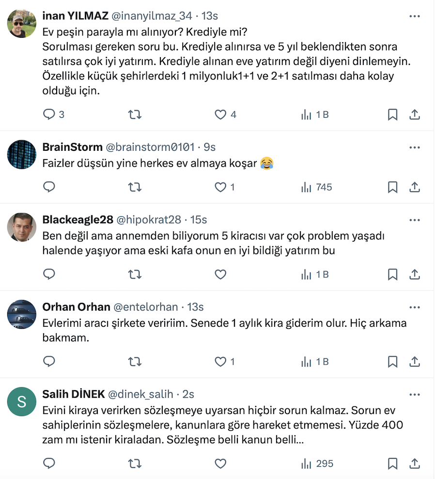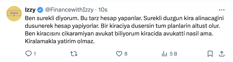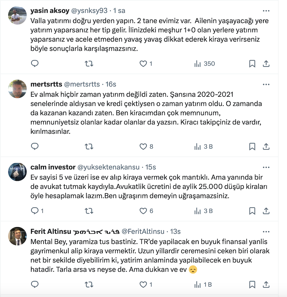 Mental Yatırım paylaşımında "O paraya 3-5 ev alırım kiraya veririm." diyenler için “Ev sahipleri yazsanıza tecrübelensinler” ifadelerini kullandı.
