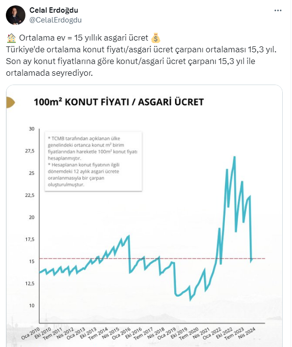 Türkiye'de ortalama konut fiyatı/asgari ücret çarpanı ortalaması 15,3 yıl. Son ay konut fiyatlarına göre konut/asgari ücret çarpanı 15,3 yıl ile ortalamada seyrediyor.