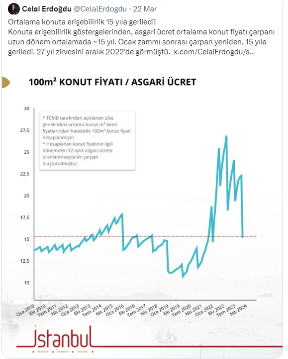 Konut fiyatlarındaki artış devam ediyor. Konut sahibi olmak isteyen vatandaşlar yüksek fiyatlardan dolayı ev sahibi olamıyor. Konut, artık bir yatırım aracı olmaktan çıkarken, milyonlarca kişinin ev almak fikri hayalden öteye geçemiyor. Şehir Plancısı Celal Erdoğdu konut fiyatlarını asgari ücretle karşılaştırdı ve gerçeği bir kez daha gün yüzüne çıkardı. Sosyal medya hesabı X'ten paylaşım yapan Erdoğdu, Türkiye'de ortalama bir konut fiyatının 15 yıllık asgari ücret yaptığını açıkladı. İşte o paylaşım ve vatandaşlardan gelen yorumlar...