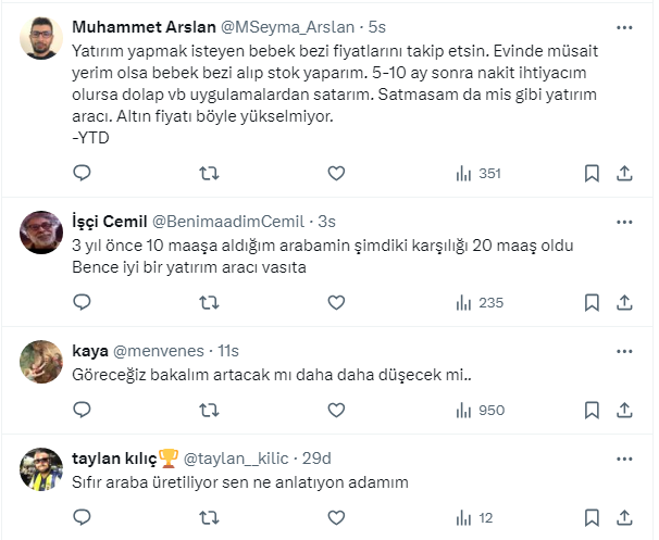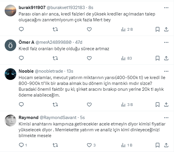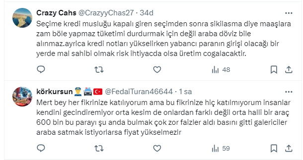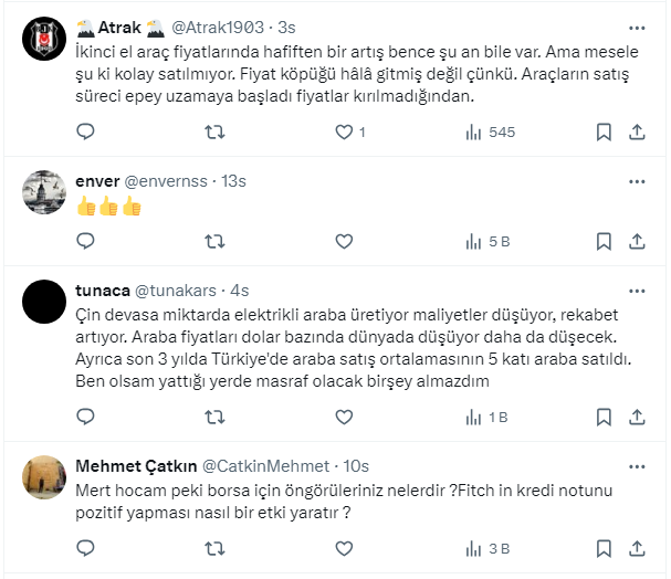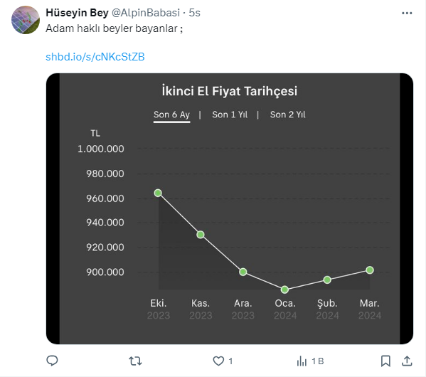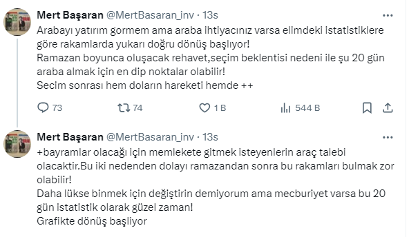 Mert Başaran seçim sonrası hem doların hareketi hem de bayramlar olacağı için memlekete gitmek isteyenlerin araç talebinin artacağını ifade ettiği paylaşımında şunları söyledi: “Bu iki nedenden dolayı ramazandan sonra bu rakamları bulmak zor olabilir! Daha lükse binmek için değiştirin demiyorum ama mecburiyet varsa bu 20 gün istatistik olarak güzel zaman! Grafikte dönüş başlıyor."