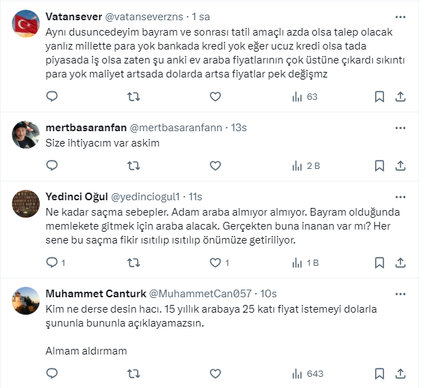 Ekonomide belirsizlik ve kredi sınırlamaları nedeniyle son dönemde otomobil piyasasında görülen durgunluk, fiyatların düşeceği yönündeki beklentiyi artırdı. Ünlü ekonomist Mert Başaran vatandaşta bu beklenti hakimden https://twitter.com/MertBasaran_inv X Sosyal medya hesabından yaptığı paylaşımda araba alacakları uyardı.