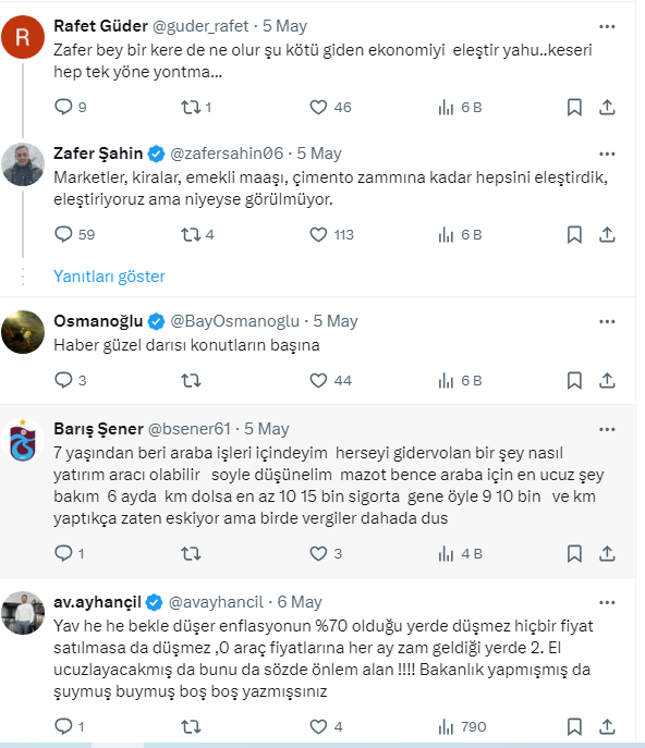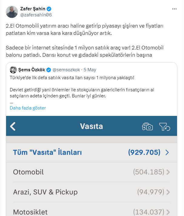 Otomobil piyasasındaki balon gittikçe sönüyor. Fahiş rakamlar yerini olması gerektiği fiyatlara bırakmaya başladı. Bayiler sıfır otomobil fiyatlarında peş peşe kampanyalar yaparken, ikinci elde de fiyatlar gittikçe geirliyor. Özellikle ikinci el araba fiyatlarına değinen Gazeteci Zafer Şahin, sadece bir internes sitesinde 1 milyon satılık araç olduğunu açıkladı. Sosyal medya hesabı X'ten açıklama yapan Şahin, '' 2.El Otomobil balonu patladı. Darısı konut ve gıdadaki spekülatörlerin başına.''dedi. İşte Şahin'in o açıklaması ve takipçilerden gelen yorumlar...