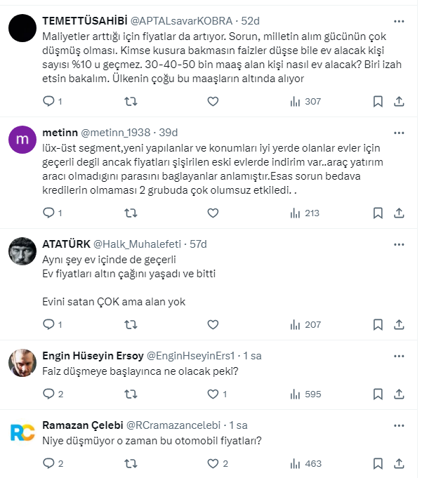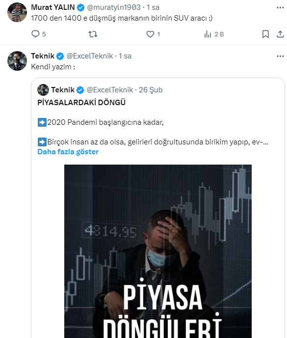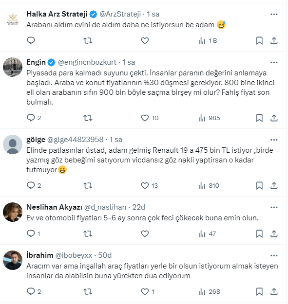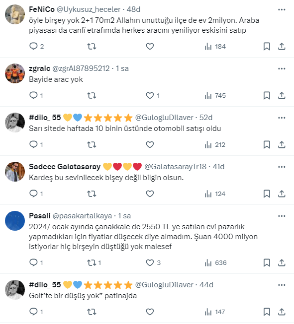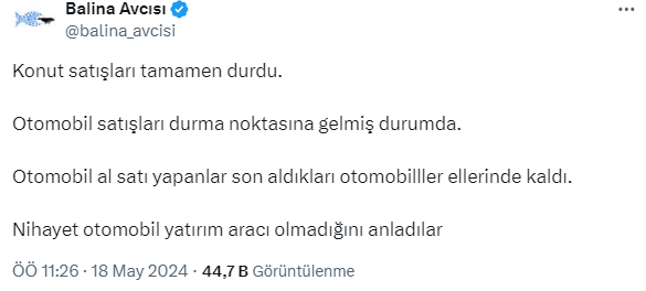 281,7 bin takipçili Balina Avcısı isimli twitter kullanıcısı, sosyal medya hesabından otomobilin bir yatırım aracı olmadığını söyledi. Otomobil piyasasını değerlendirerek, satışların neredeyse durma noktasına geldiği belirtildi. İkinci el ve sıfır otomobil fiyatlarında gerileme devam edior. Sıfır otomobil satışı yapan bayiler, indirim ve kampanyalarla satışlarına devam ederken, ikinci elde de durgunluk söz konusu. Milyonlarca kişi otomobil fiyatlarının ne olacağını merak ederken, uzmanlar fiyatların yüzde 10-15 daha düşmesinin beklendiğini açıkladı. Balina Avcısı sosyal medya hesbaı X'ten yaptığı paylaşımda otomobil piyasasının son durumunu değerlendirdi. İşte o paylaşım ve vatandaşlardan gelen yorumlar...