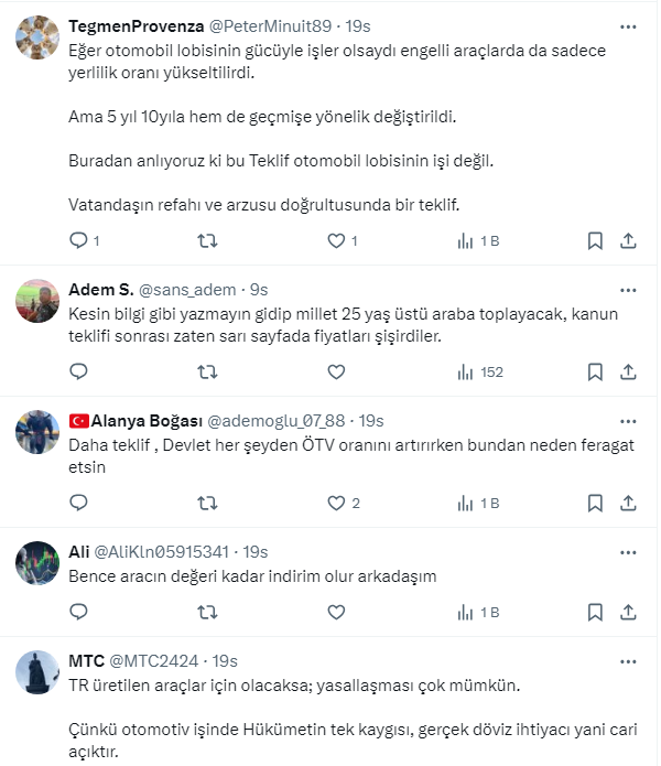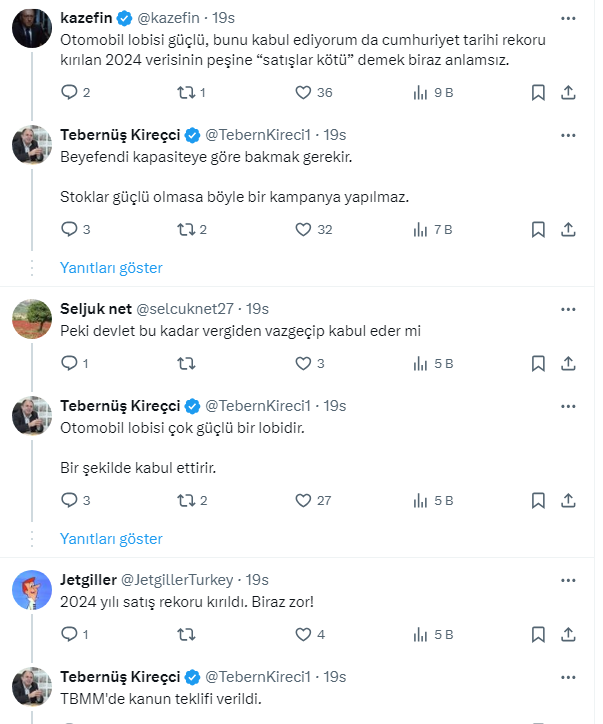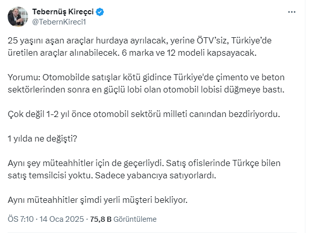Konuyla ilgili açıklamalarda bulunan Tebernüş Kireçci, otomobilde satışlar kötü gidince Türkiye'de çimento ve beton sektörlerinden sonra en güçlü lobi olan otomobil lobisinin düğmeye bastığını söyledi.