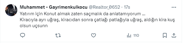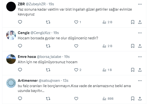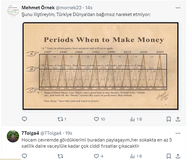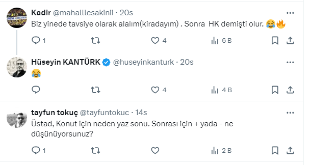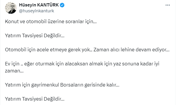 Hüseyin Kantürk https://twitter.com/huseyinkanturk X sosyal medya hesabından yaptığı paylaşımda, “Otomobil için aceleye gerek olmadığını ve zamanın alıcı lehine işlediğini söyleyerek, oturmak için ev alacaklar için yaz sonuna kadar iyi zaman olduğunu belirtti. Yatırım için gayrimenkulün borsaların gerisinde kalacağını ekledi.