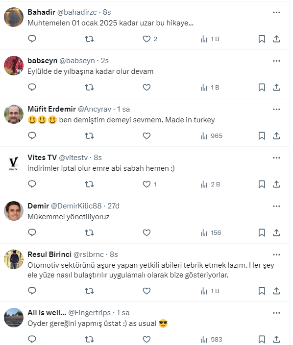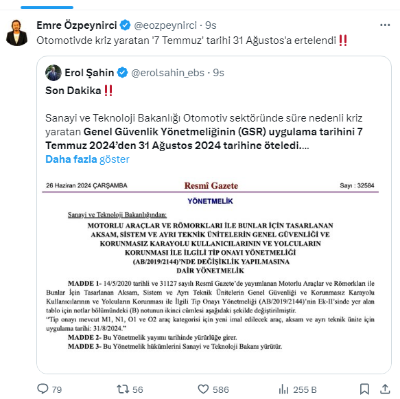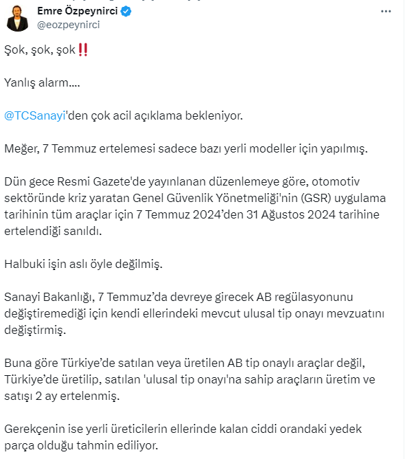 Konuyu sosyal medya hesabından paylaşan Gazeteci Emre Özpeynirci otomotivde kriz yaratan uygulamanın ertelendiğini duyurmuş sonrasında ''yanlış alarm' diyerek doğru bilgiyi aktardı. Emre Özpeynirci dün gece Resmi Gazete'de yayınlanan düzenlemeye göre, otomotiv sektöründe kriz yaratan Genel Güvenlik Yönetmeliği'nin (GSR) uygulama tarihinin tüm araçlar için 7 Temmuz 2024’den 31 Ağustos 2024 tarihine ertelendiği sanıldığını fakat işin aslının öyle olmadığını açıkladı. Konunun aslı ise; Sanayi Bakanlığı, 7 Temmuz’da devreye girecek AB regülasyonunu değiştiremediği için kendi ellerindeki mevcut ulusal tip onayı mevzuatını değiştirmiş. Özpeynirci ilk olarak şu paylaşımı yapmıştı;