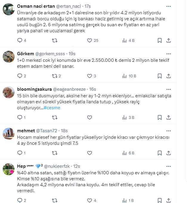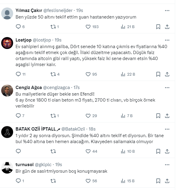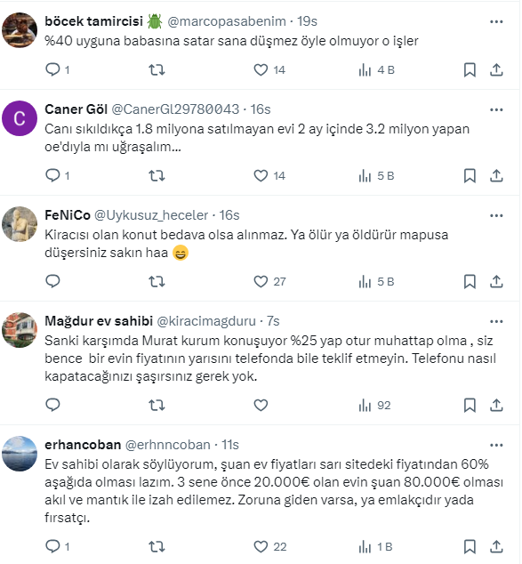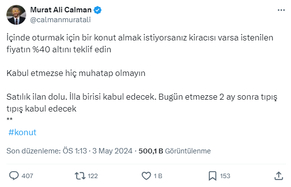 Konut satışları geçen seneye göre düşüşe geçti. Özellikle ikinci el konuta talep gittikçe azalmaya başladı. Yeni konutların ise fiyatlarından yanına yaklaşılamıyor. Konut almak isteyen milyonlarca kişi fahiş fiyat ve kredi faizlerinden dolayı alamıyor. Bu durum satılık konut ilanlarını artırdı. Son zamanlarda konut yatırım aracı olmaktan çıkıp sadece oturmak için alınmaya başladı. Sosyal medya hesabından paylşaım yapan kripto fenomeni Murat Ali Calman, oturmak için konut alanları uyardı. İçinde kiracı olan bir evin satın alanlara seslenen Calman yüzde 40 daha altında fiyat teklif edilmesini önerdi. İşte o paylaşım ve gelen yorumlar...