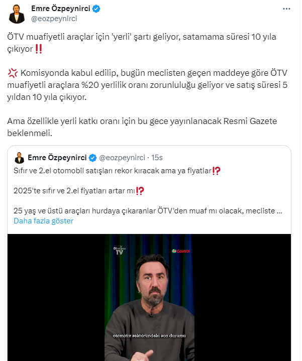 Gazeteci Emre Özpeynirci, sosyal medya hesabından konutla ilgili paylaşımda bulunarak, ÖTV'siz araç alacakları baştan uyardı. İşte o paylaşım...