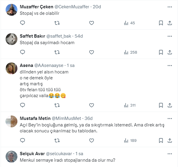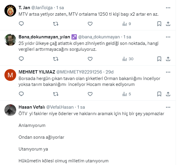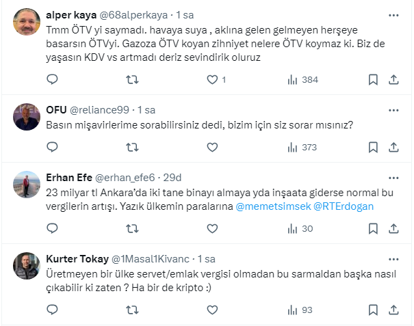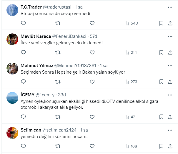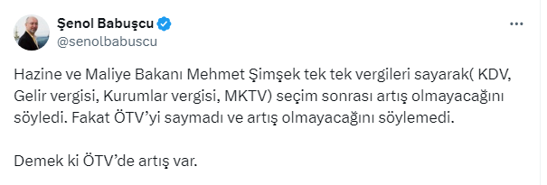 Bakan Şimşek’in bu açıklamaları üzerine Ziraat Bankası Eski Genel Müdür Yardımcısı, Ekonomist Şenol Babuşçu https://twitter.com/senolbabuscu X sosyal medya hesabından bir paylaşım yaparak, “Hazine ve Maliye Bakanı Mehmet Şimşek tek tek vergileri sayarak( KDV, Gelir vergisi, Kurumlar vergisi, MKTV) seçim sonrası artış olmayacağını söyledi. Fakat ÖTV’yi saymadı ve artış olmayacağını söylemedi. Demek ki ÖTV’de artış var” dedi. Takipçilerinin Babuşçu’nun gönderisine yaptığı yorumlar da yeni vergiler bekledikleri yönünde oldu.
