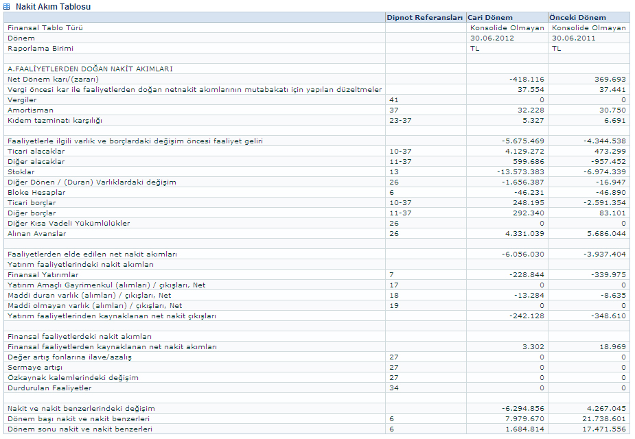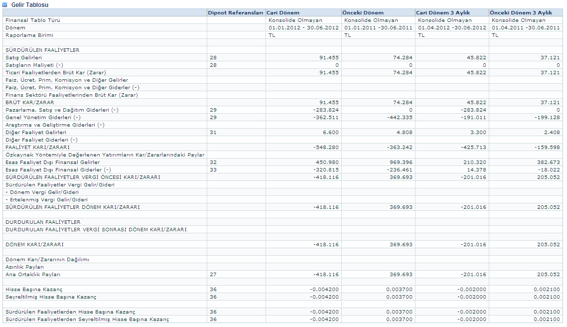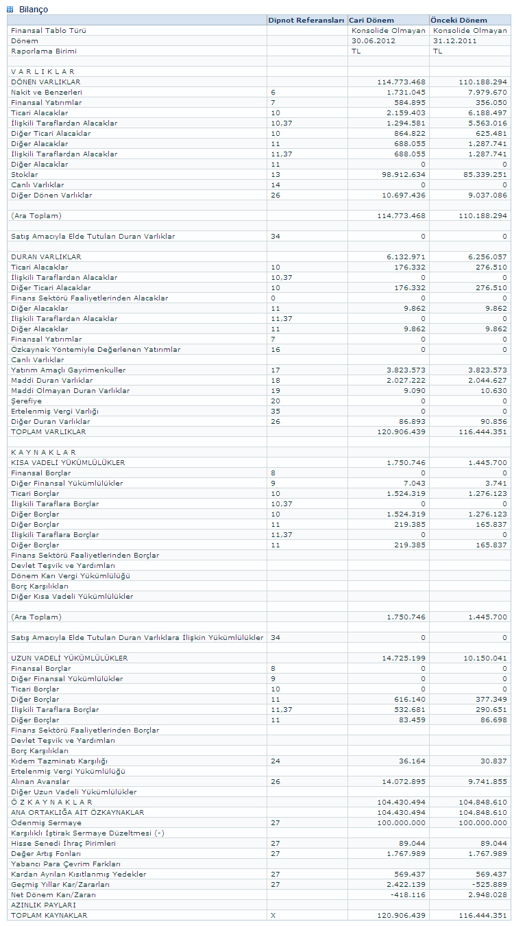 01.01.2012 - 30.06.2012 ARA DÖNEMİNE AİT