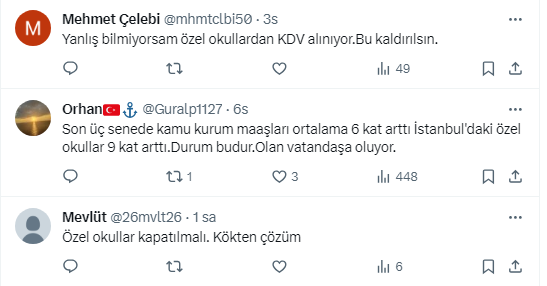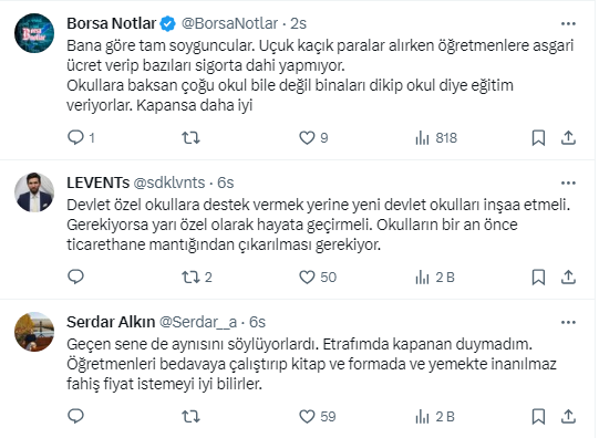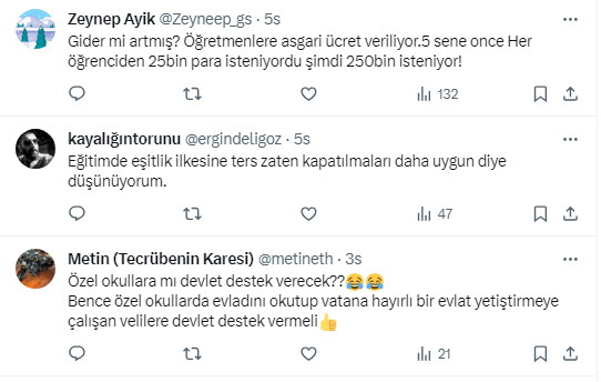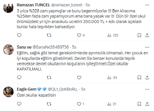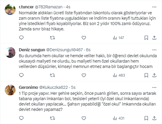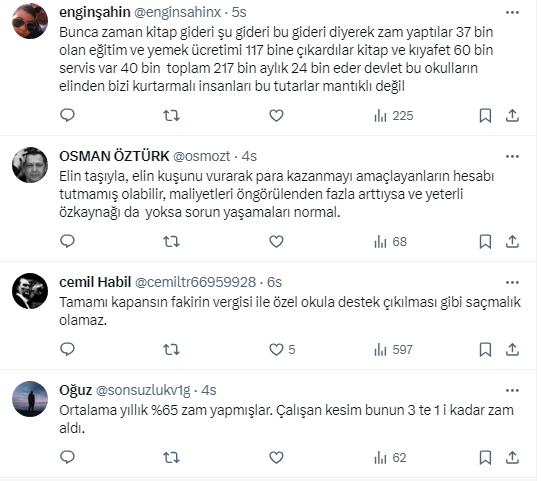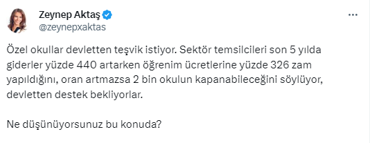 Özel okullarda eğitim ücretlerine yapılan zamlar velileri kara kara düşündürüyor. Okullar ise zamdan memnun değil. Zam oranını yetersiz bulan okulların devletten teşvik isteğini belirten Gazeteci Zeynep Aktaş X sosyal medya hesabından yaptığı paylaşımda, “Ne düşünüyorsunuz bu konuda” diye sordu.