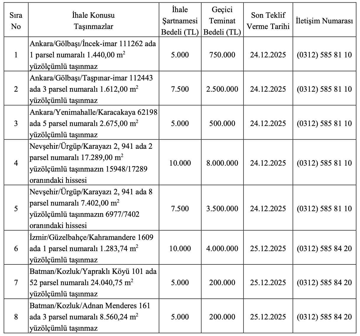 Söz konusu bu gayrimenkuller için son teklifler, 24 ve 25 Aralık tarihlerine kadar alınacak.