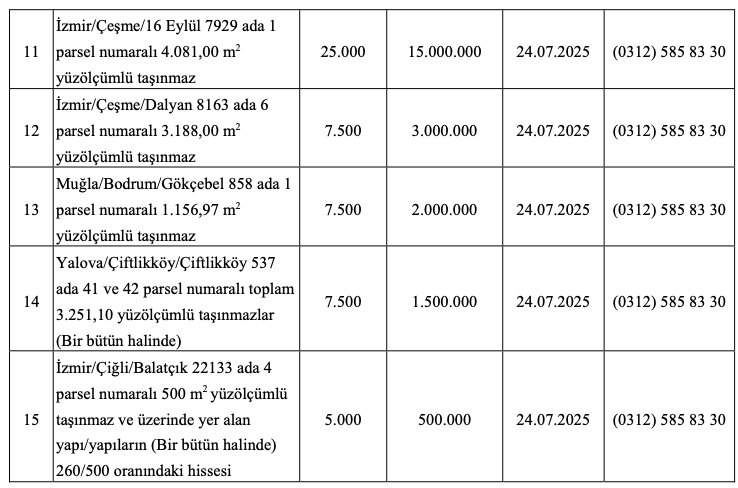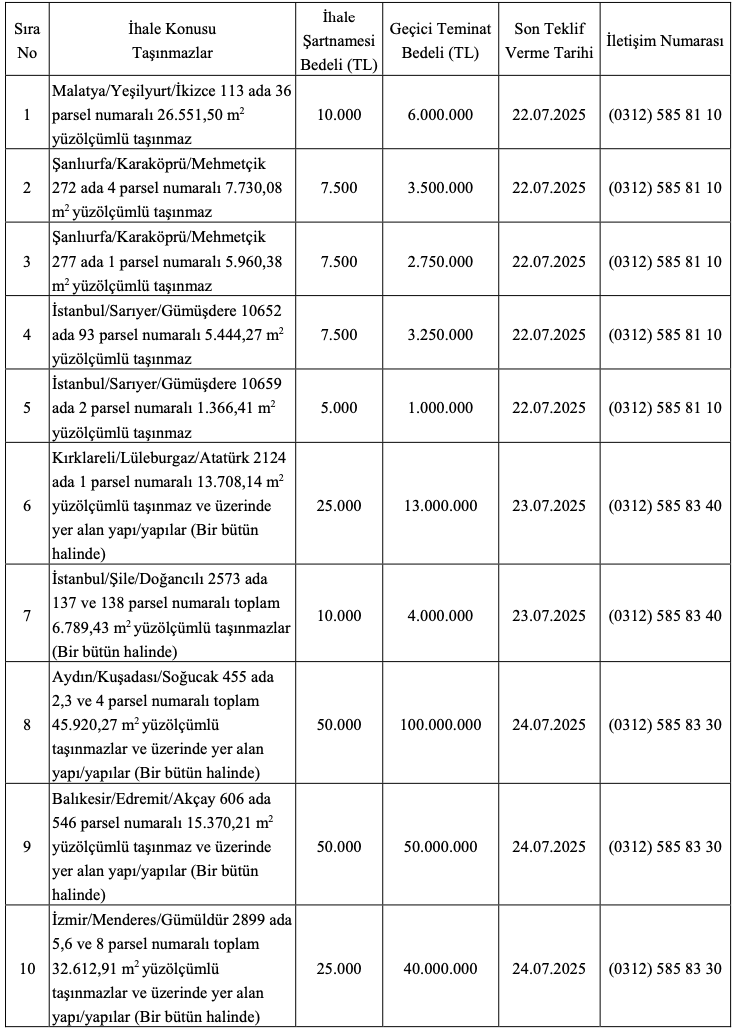 İhale kapsamında Malatya Yeşilyurt, Şanlıurfa Karaköprü, İstanbul Sarıyer ve Şile, Kırklareli Lüleburgaz, Aydın Kuşadası, Balıkesir Edremit, İzmir Menderes, Çeşme ve Çiğli, Muğla Bodrum ve Yalova Çiftlikköy’deki taşınmazlar yeni sahiplerini bekliyor.