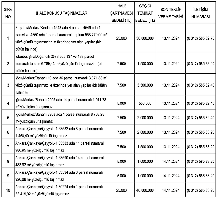 - Kırşehir/Merkez/Kındam’da yer alan toplam 558 bin 770,00 metrekare yüzölçümlü taşınmazlar ile üzerinde yer alan yapılar (bir bütün halinde) için açıklanan geçici teminat 30 milyon Türk Lirası