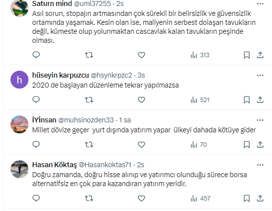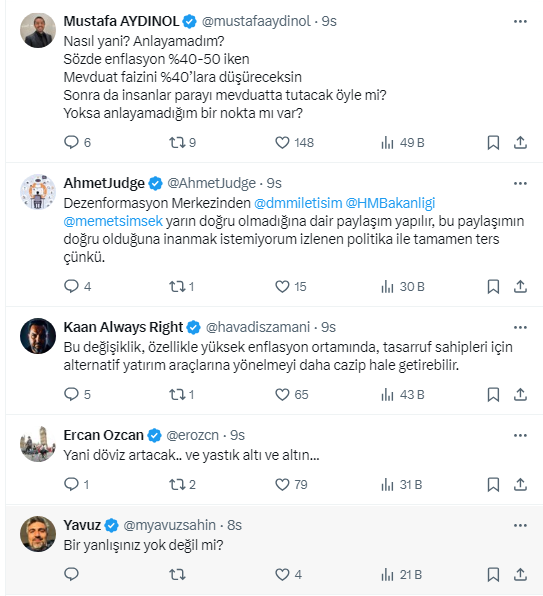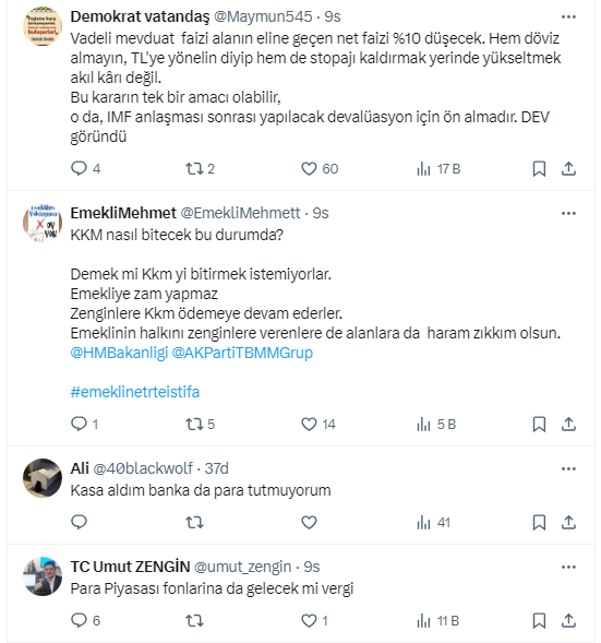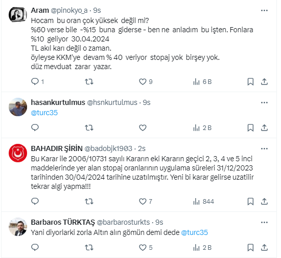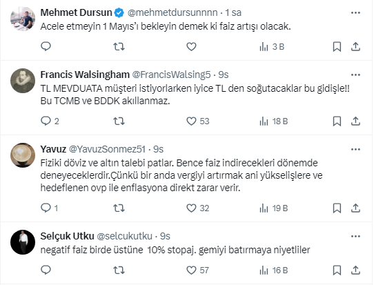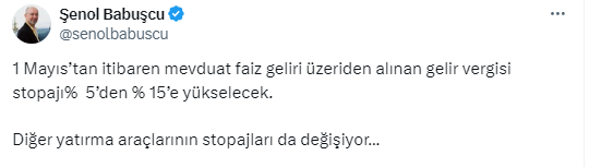 Sürenin yaklaşması üzerine Ziraat Bankası Eski Genel Müdür Yardımcısı, Ekonomist Şenol Babuşçu https://twitter.com/senolbabuscu X sosyal medya hesabından yaptığı paylaşımda, “1 Mayıs’tan itibaren mevduat faiz geliri üzeriden alınan gelir vergisi stopajı% 5’den % 15’e yükselecek. Diğer yatırma araçlarının stopajları da değişiyor… Süresi dolan mevduat hesapları için stopaj oranı yüzde 15’e yükselebilir” dedi. Paylaşıma gelen yorumlarda bu durumun vatandaşı tekrar altın ve döviz almaya yönelteceği belirtildi.