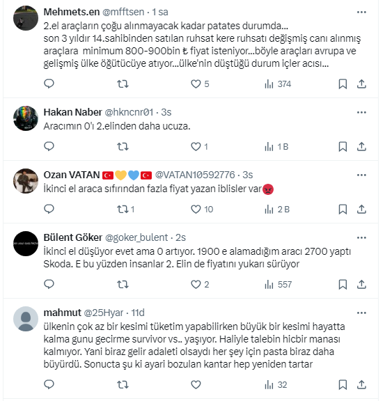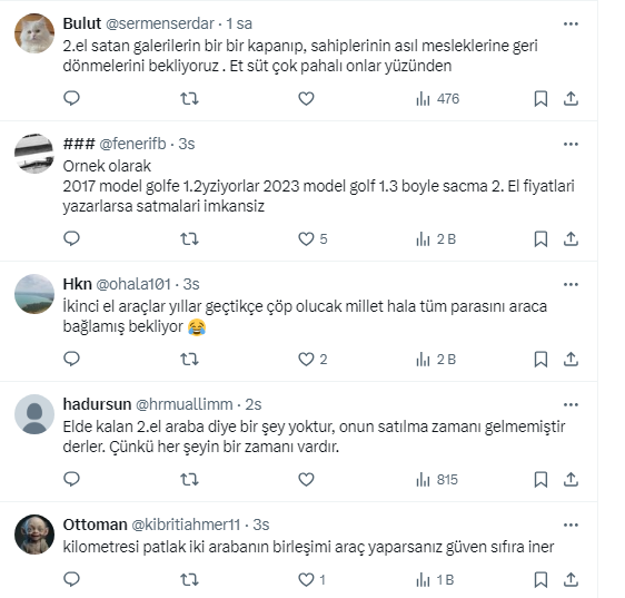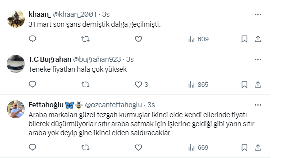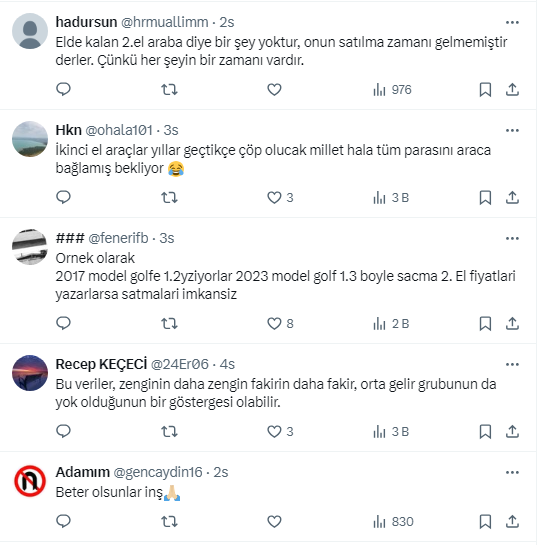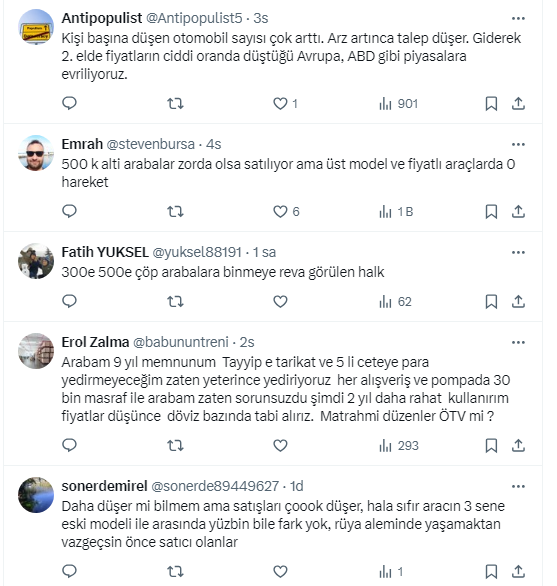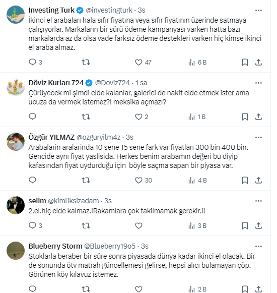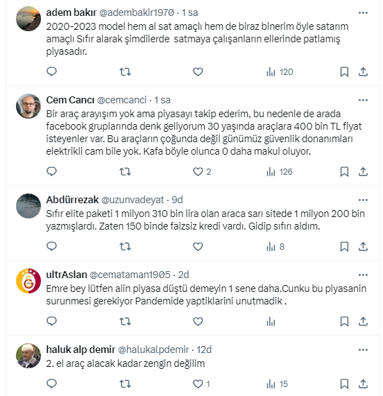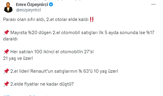 Peki otomotiv piyasısında son durum ne? Gazeteci Emre Özpeynirci https://x.com/eozpeynirci X sosyal medya hesabından yaptığı paylaşımda, “Parası olan sıfır aldı, ikinci el otolar elde kaldı” dedi.