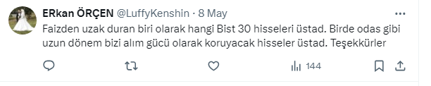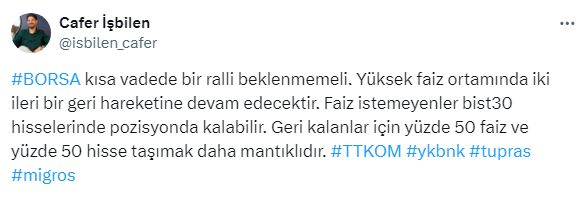 Stratejist Cafer İşbilen https://twitter.com/isbilen_cafer X sosyal medya hesabından yaptığı paylaşımda . borsada kısa vadede ralli beklenmemesi gerektiğini söyleyerek, endeksin yüksek faiz ortamında iki ileri bir geri hareketine devam edeceğini ifade etti. İşbilen,”Faiz istemeyenler bist30 hisselerinde pozisyonda kalabilir. Geri kalanlar için yüzde 50 faiz ve yüzde 50 hisse taşımak daha mantıklıdır” dedi.