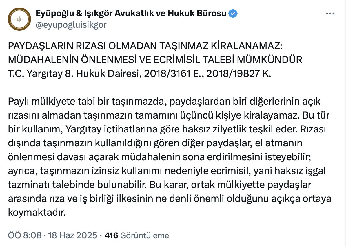 Eyüpoğlu - Işıkgör Avukatlık ve Hukuk Bürosu yaptığı paylaşımda paydaşların rızası olmadan taşınmaz kiralanamayacağını belirtti.