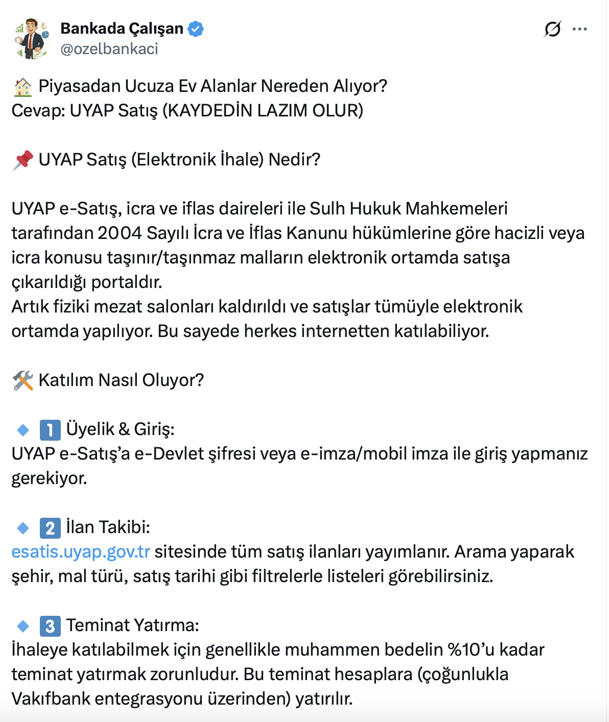 Pek çok kişi konu ile ilgili araştırma yaparken, Bankada Çalışan isimli kullanıcı resmi X hesabı https://x.com/ozelbankaci üzerinden yaptığı paylaşımda piyasadan ucuza ev alanların nereden aldığını açıkladı.