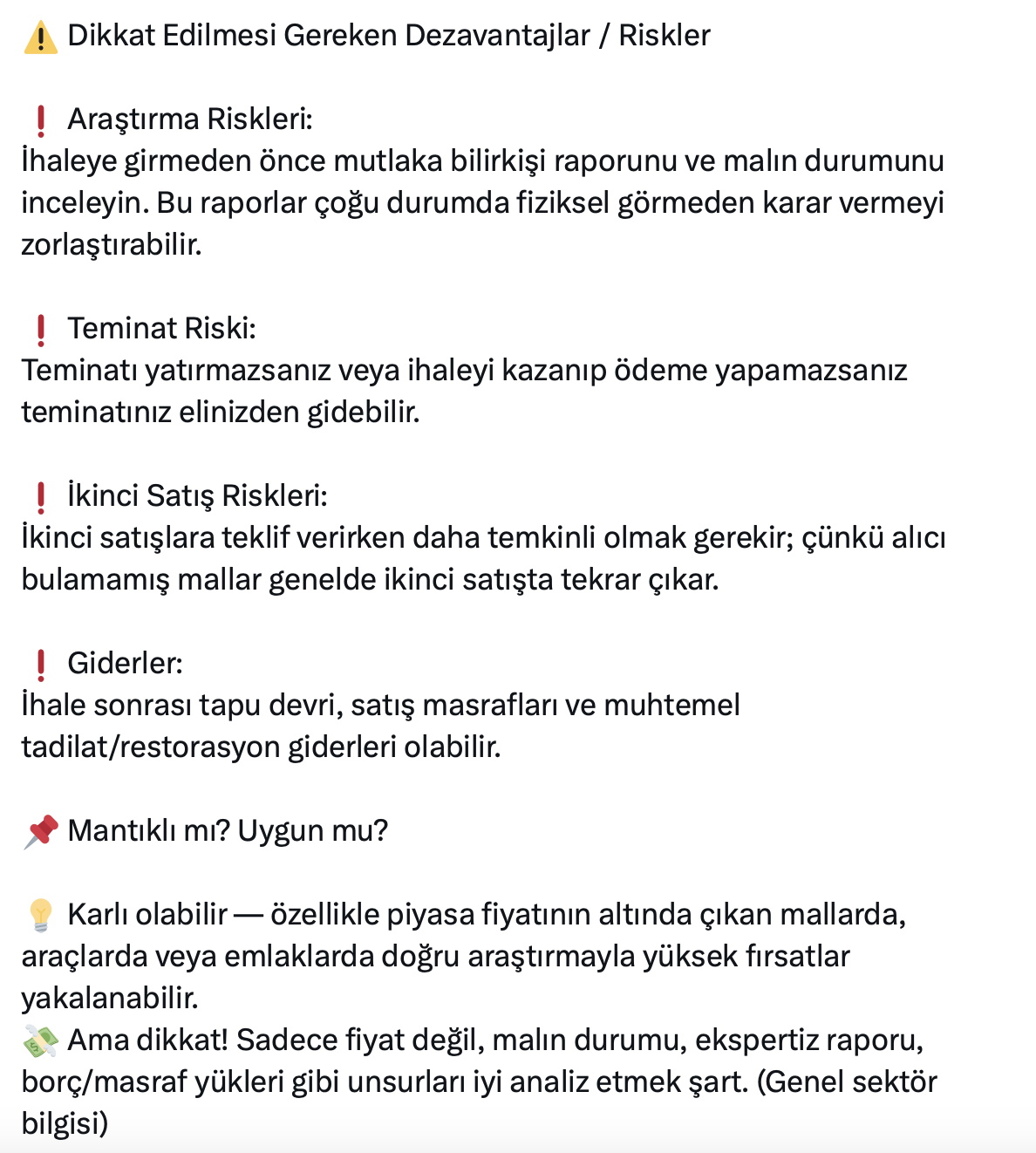 İhaleye girmeden önce mutlaka bilirkişi raporunu ve malın durumunu inceleyin. Bu raporlar çoğu durumda fiziksel görmeden karar vermeyi zorlaştırabilir.
