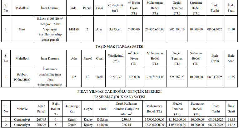 Satışa çıkarılan gayrimenkullerin yüz ölçümleri 226,14 metrekare ile 9 bin 220,39 metrekare arasında değişiyor.
