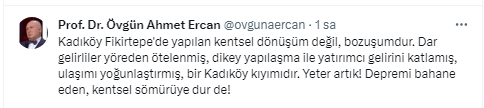 Jeofizik yüksek mühendisi Prof. Dr. Övgün Ahmet Ercan, kentsel dönüşüm projelerine ilişkin paylaşım yaptı. Ercan, "Kadıköy Fikirtepe'de yapılan kentsel dönüşüm değil, bozuşumdur" diye ifade ederek "Depremi bahane eden, kentsel sömürüye dur de!" dedi.