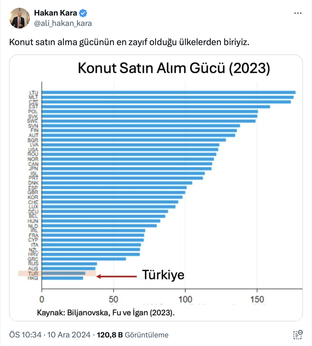 Prof. Dr. Ali Hakan Kara, resmi X hesabı https://twitter.com/ali_hakan_kara üzerinden yaptığı paylaşımda konut satın alım gücü ile ilgili bir grafik paylaşarak, “Konut satın alma gücünün en zayıf olduğu ülkelerden biriyiz!” Dedi.