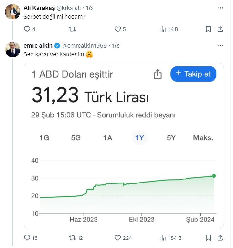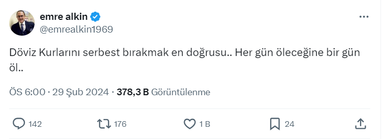 Döviz kurlarında yaşanan gelişmeler gündemden düşmezken Prof. Dr. Emre Alkin'den de dikkat çeken döviz kuru yorumu geldi. Emre Alkin resmi X hesabı https://twitter.com/emrealkin1969 üzerinden yaptığı paylaşımda döviz kurlarını serbest bırakmanın en doğrusu olduğunu belirterek, "Her gün öleceğine bir gün öl" ifadelerini kullandı.