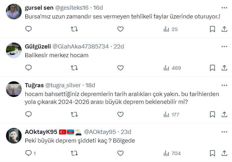 Naci Görür ayrıca paylaşımında Mustafakemalpaşa-Orhaneli Fay zonuna işaret ederek buradaki fayların büyük deprem üretme potansiyeli olduğunu da kaydetti.