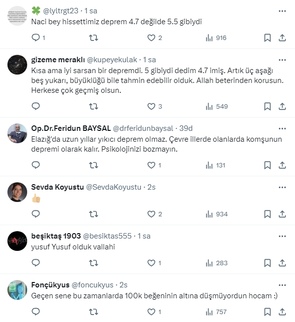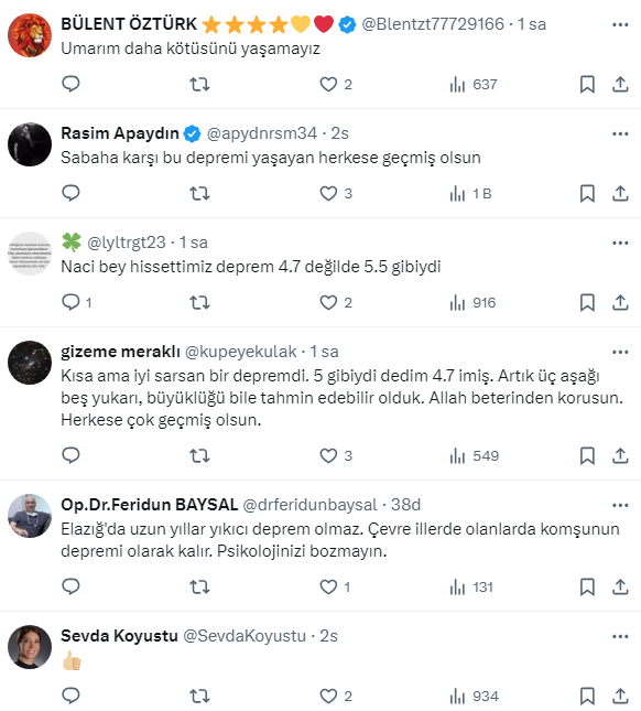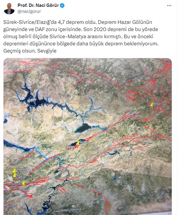 ''Sürek-Sivrice/Elazığ’da 4,7 deprem oldu. Deprem Hazar Gölünün güneyinde ve DAF zonu içerisinde. Son 2020 depremi de bu yörede olmuş belirli ölçüde Sivrice-Malatya arasını kırmıştı. Bu ve önceki depremleri düşününce bölgede daha büyük deprem beklemiyorum. Geçmiş olsun. Sevgiyle.'' dedi.
