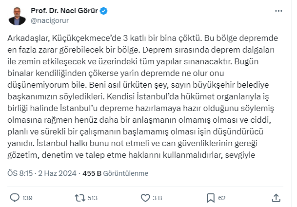 Deprem Uzmanı Prof. Dr. Naci Görür, Küçükçekmece'de yıkılan bina ile ilgili sosyal medya hesabı X'ten açıklama yaptı. Açıklamanın altına yüzlerce yorum geldi. İşte o açıklama ve gelen yorumlar...