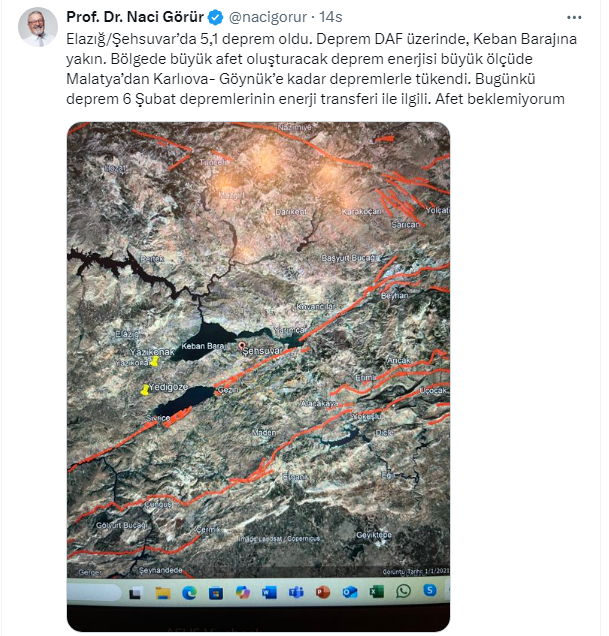 Görür, depreme ilişkin sosyal medya üzerinden yaptığı deeğerlendirmede, "Elazığ/Şehsuvar'da 5,1 deprem oldu. Deprem DAF üzerinde, Keban Barajına yakın. Bölgede büyük afet oluşturacak deprem enerjisi büyük ölçüde Malatya'dan Karlıova- Göynük'e kadar depremlerle tükendi. Bugünkü deprem 6 Şubat depremlerinin enerji transferi ile ilgili. Afet beklemiyorum" ifadelerine yer verdi.