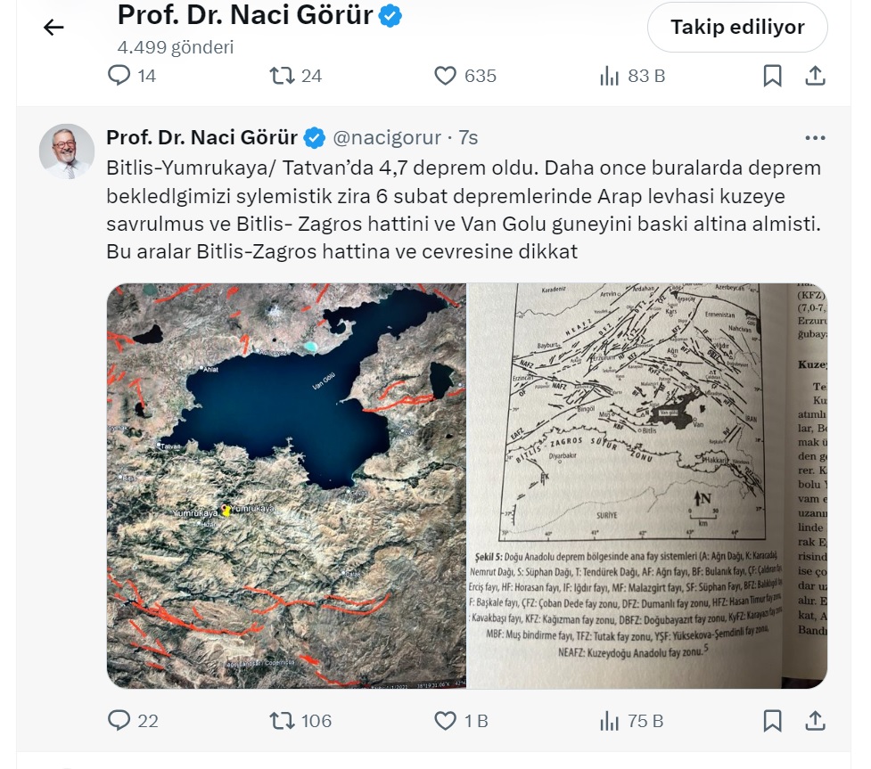 Prof. Dr. Görür, sosyal medya hesabı X yaptığı açıklamada “Bu aralar Bitlis-Zagros hattına ve çevresine dikkat” dedi.