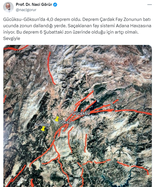 Deprem uzmanı Prof. Dr. Naci Görür, sosyal medya hesabı X'ten ''Bu deprem 6 Şubattaki zon üzerinde olduğu için artçı olmalı.'' ifadesini kullandı.