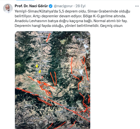 Yer bilimci Prof. Dr. Naci Görür, saat 12.59'da meydana gelen Kütahya Simav merkezli depreme ilişkin sosyal medya hesabından önemli açıklamalarda bulundu. Görür, buradaki fayla ilgili 'normal atılımlı fay' ifadesini kullandı.