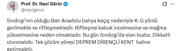 ''Sındırgı’nın olduğu Batı Anadolu batıya kaçış nedeniyle K-G yönlü gerilmekte ve riftleşmektedir. Riftleşme kabuk incelmesine ve mağma yükselmesine neden olmaktadır. Bu gün Sındırgı’da olan budur. Dikkatli olunmalıdır. Tek çözüm yöreyi DEPREM DİRENÇLİ KENT haline getirmektir.''