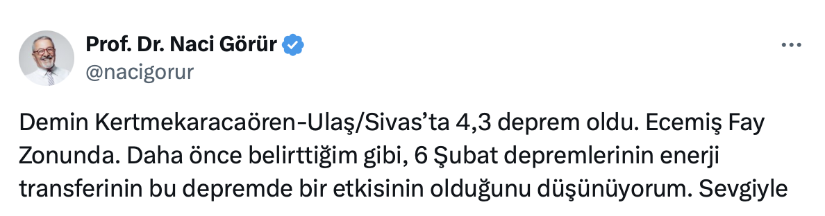 Naci Görür yaptığı paylaşımda Sivas'taki 4.4'lük depremle ilgili 6 Şubat'ı işaret etti.