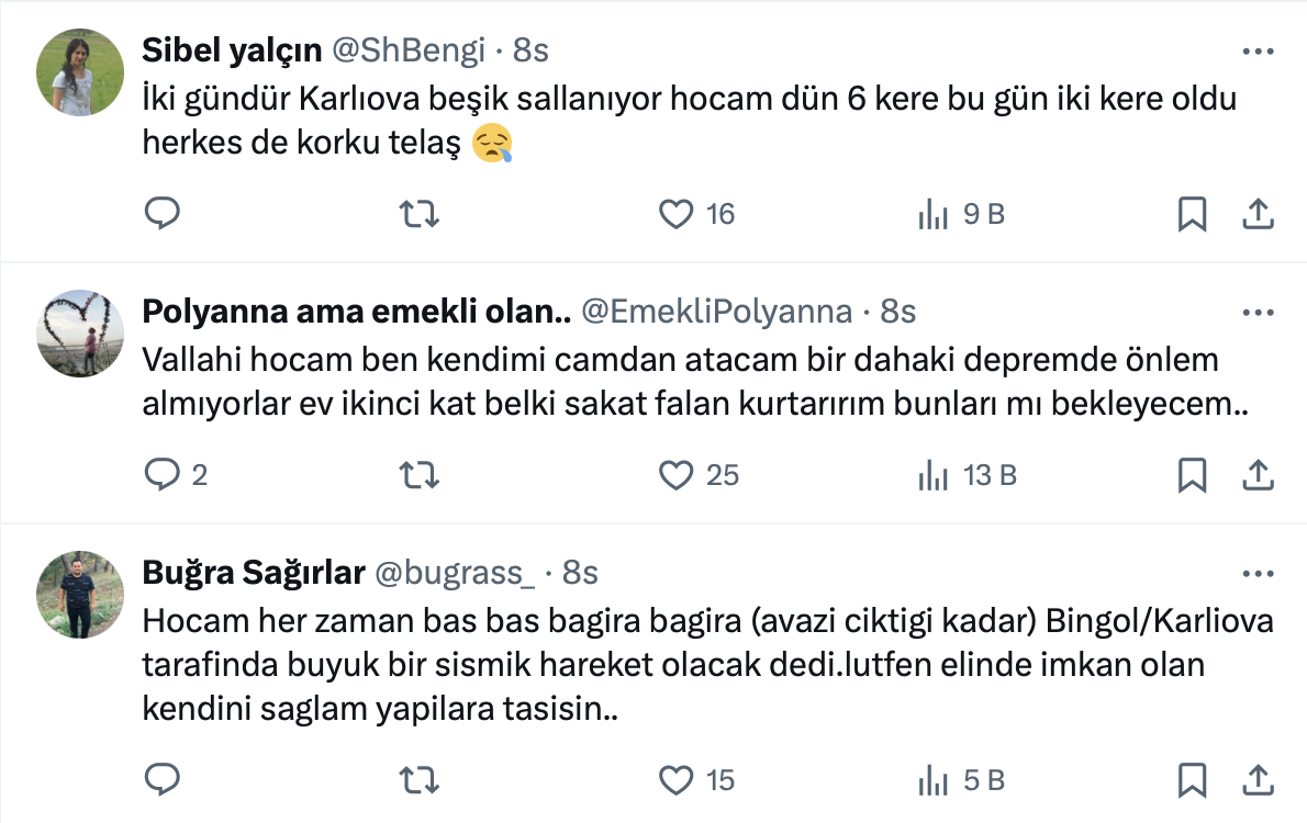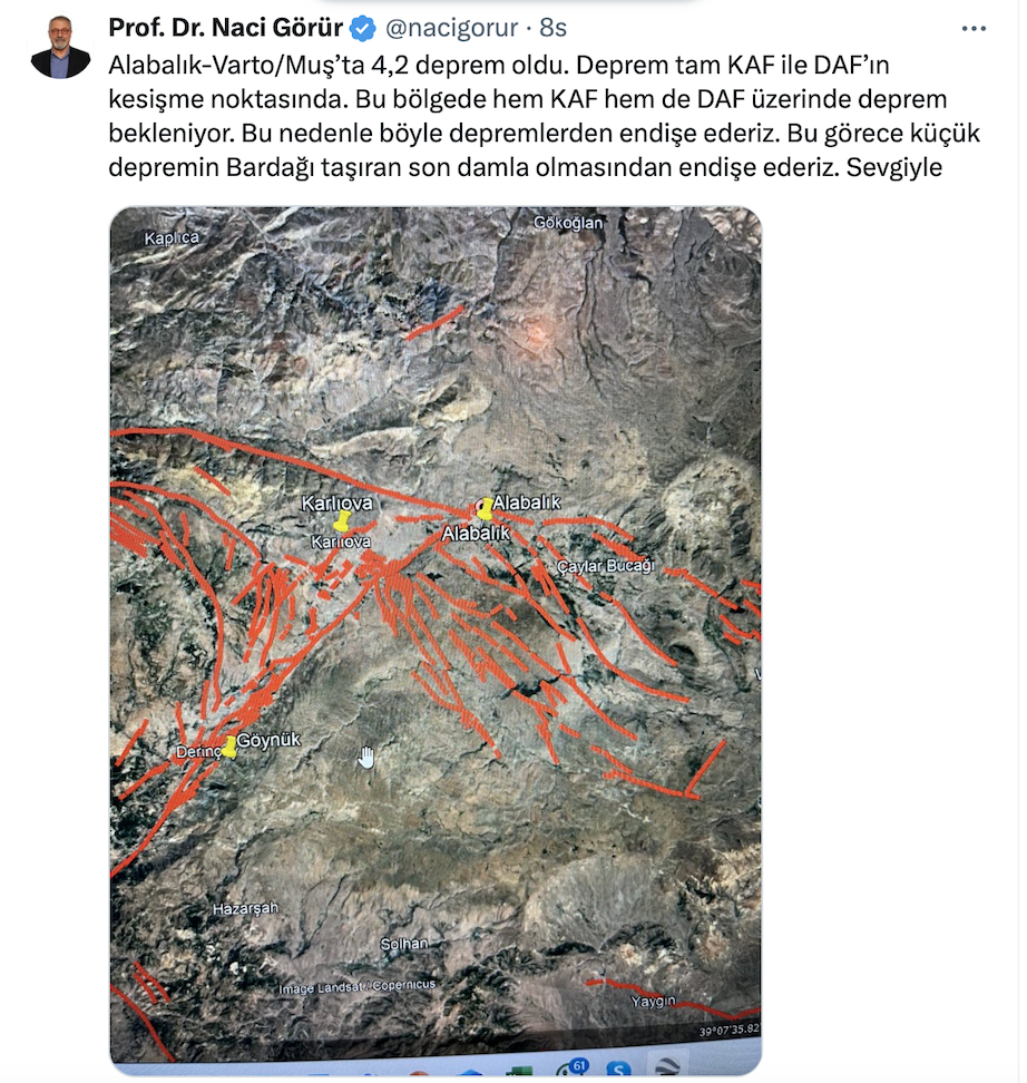 Alabalık-Varto/Muş’ta 4,2 deprem oldu. Deprem tam KAF ile DAF’ın kesişme noktasında. Bu bölgede hem KAF hem de DAF üzerinde deprem bekleniyor. Bu nedenle böyle depremlerden endişe ederiz. Bu görece küçük depremin Bardağı taşıran son damla olmasından endişe ederiz. Sevgiyle