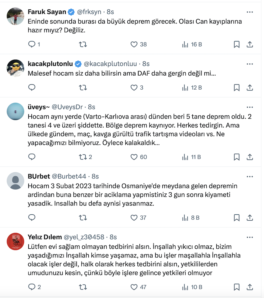 Yaptığı her açıklama gündeme bomba gibi düşen Naci Görür depremin KAF ile DAF'ın kesişme noktasında gerçekleştiğini dile getirerek, bu iki fay hattında da deprem beklendiğini ifade etti. Resmi sosyal medya hesabı https://x.com/nacigorur üzerinden yaptığı paylaşımda bu sebeple böylesi depremlerin 'endişe verici' olduğunu dile getiren Prof. Dr. Görür, "Bu görece küçük depremin bardağı taşıran son damla olmasından endişe ederiz" ifadesini kullandı.