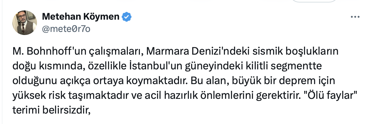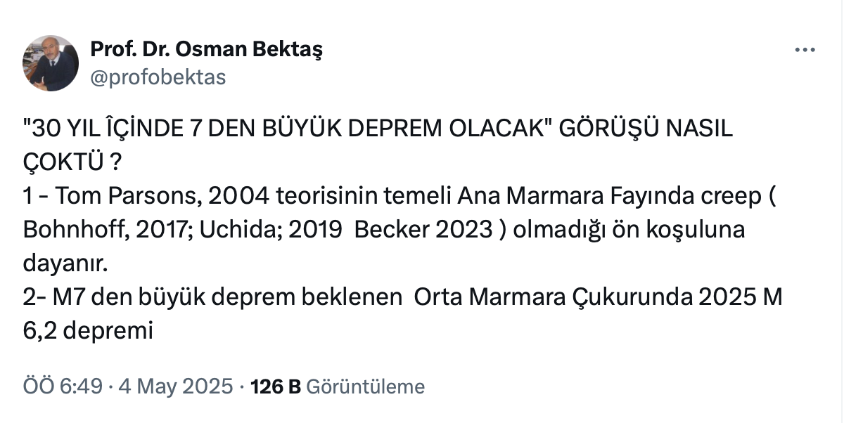 Osman Bektaş paylaşımında şu ifadeleri kullandı: “Tom Parsons, 2004 teorisinin temeli Ana Marmara Fayında creep ( Bohnhoff, 2017; Uchida; 2019 Becker 2023 ) olmadığı ön koşuluna dayanır.