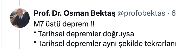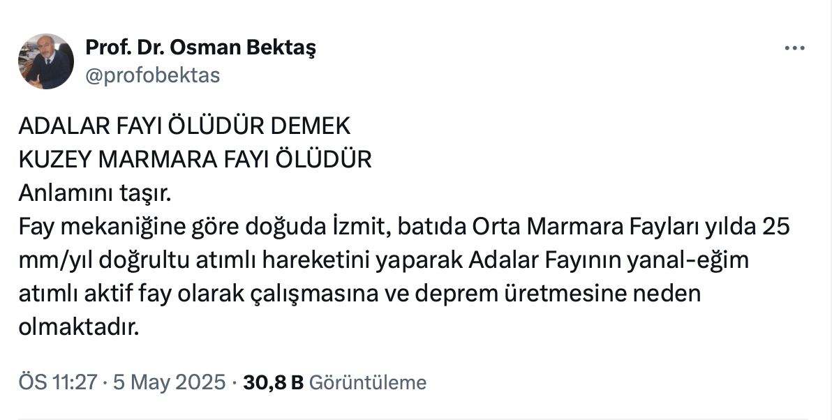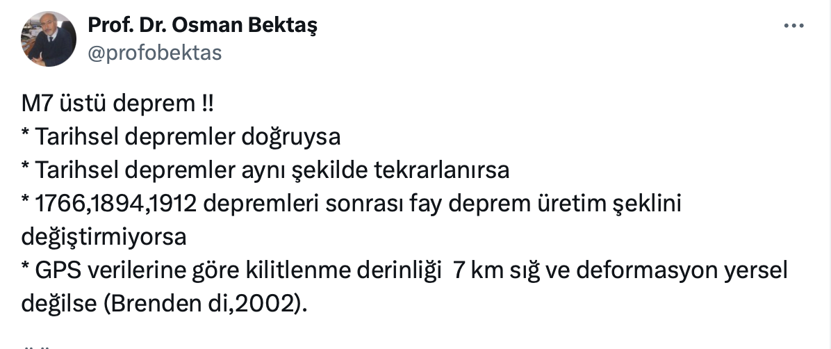 Deprem bilimci Prof. Dr. Osman Bektaş’ın paylaşımı şu şekilde: