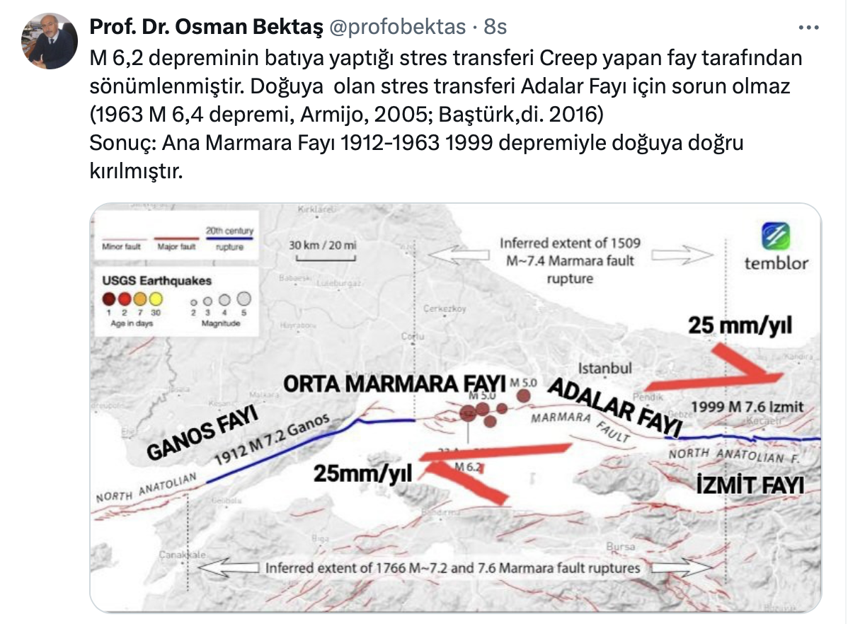 Prof. Dr. Osman Bektaş resmi sosyal medya hesabı üzerinden yaptığı paylaşımda “Ana Marmara Fayı 1912-1963 1999 depremiyle doğuya doğru kırılmıştır.” dedi.