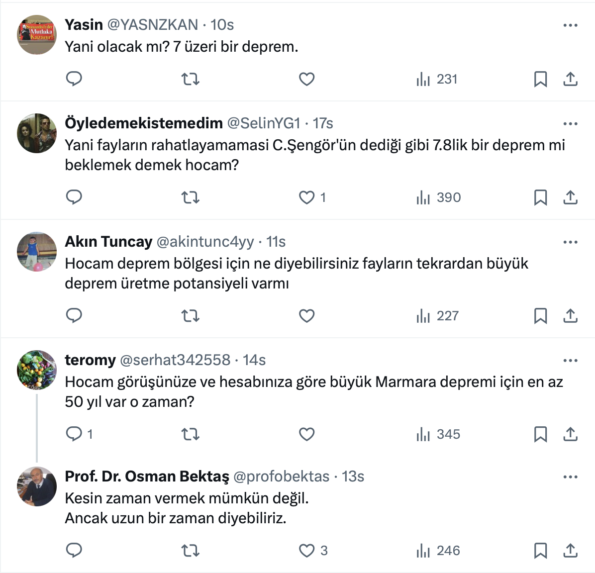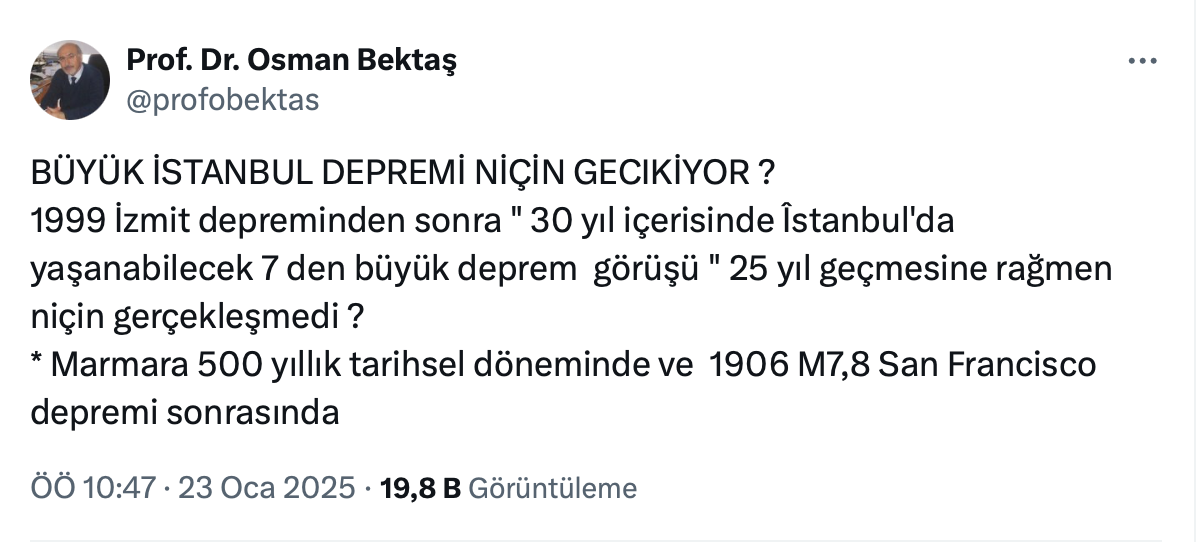 Prof. Dr. Osman Bektaş paylaşımında şu ifadeleri kullandı: “1999 İzmit depreminden sonra '30 yıl içerisinde İstanbul'da yaşanabilecek 7 den büyük deprem görüşü 25 yıl geçmesine rağmen niçin gerçekleşmedi?