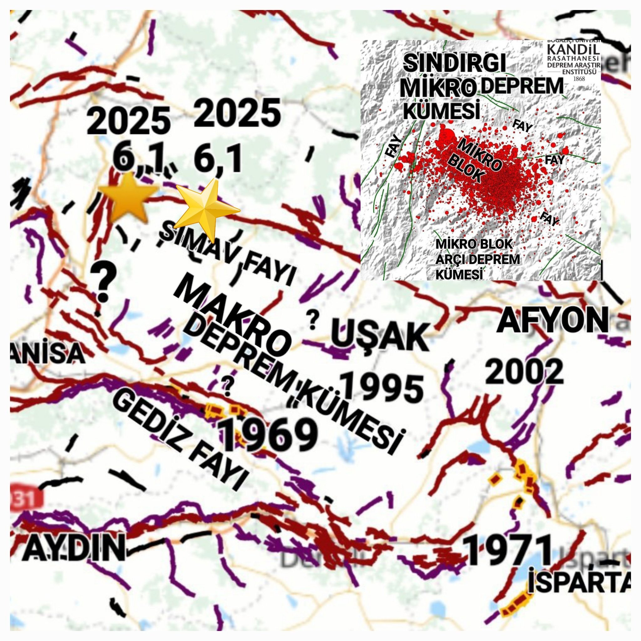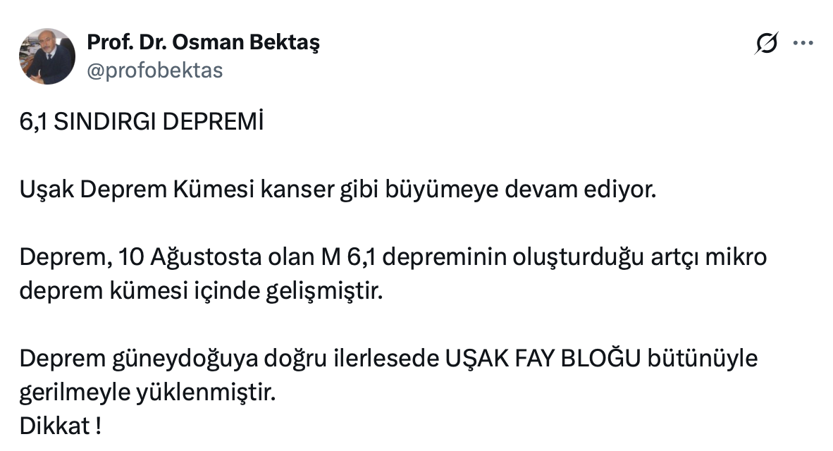 Deprem bilimci Prof. Dr. Osman Bektaş resmi sosyal medya hesabı https://x.com/profobektas üzerinden 6,1 büyüklüğündeki Sındırgı depremi ile ilgili olarak yaptığı açıklamada Uşak deprem Kümesinin kanser gibi büyümeye devam ettiğini belirtti.