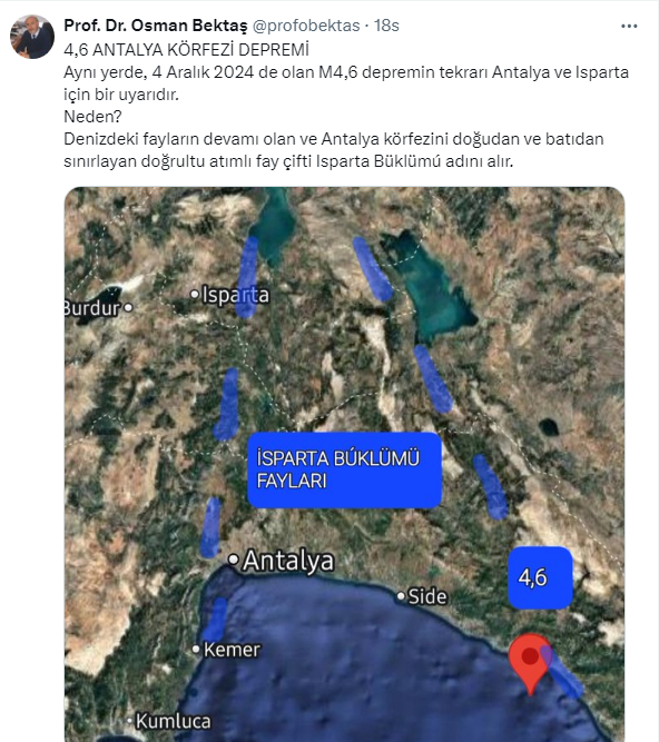 Prof. Dr. Osman Bektaş sosyal meyda hesabından, Antalya Körfezi'nde meydana gelen depremi değerlendirdi. Bektaş, 4.6 şiddetinde bir depremin geçen sene Aralık ayında da meydana geldiğini söyleyerek 'tekrarı' şeklinde açıkladı.