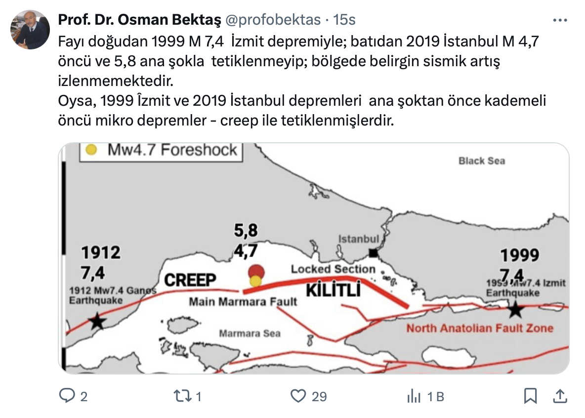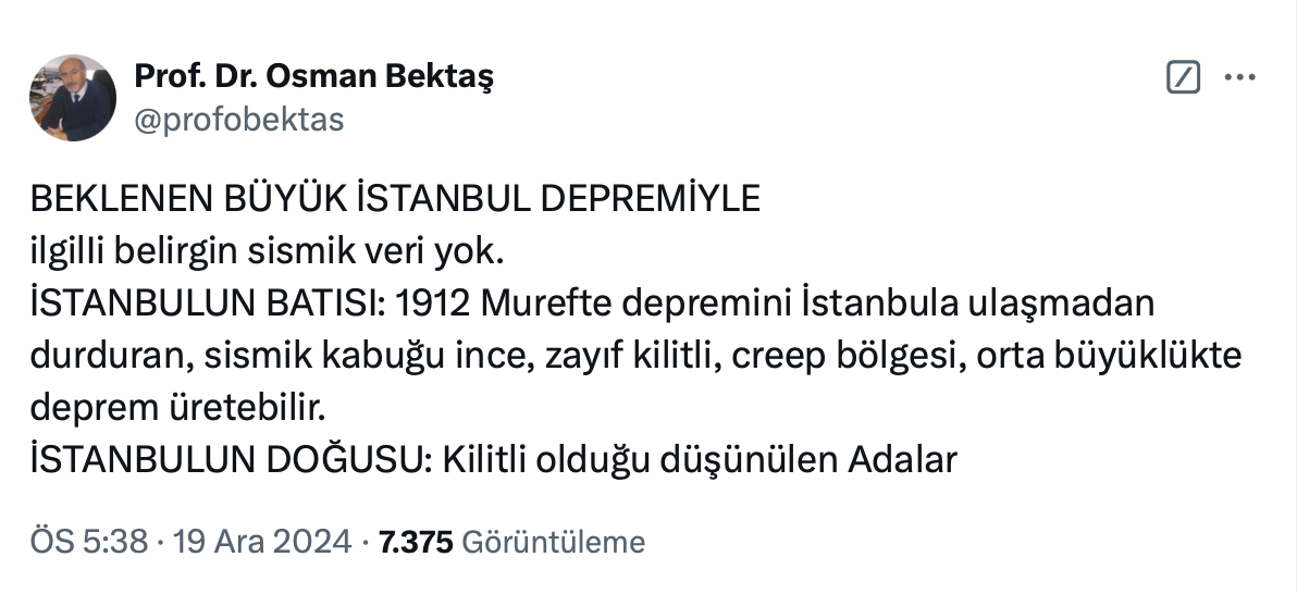 Prof. Dr. Osman Bektaş da resmi sosyal medya hesabı https://x.com/profobektas üzerinden İstanbul depremi ile ilgili bir açıklama yaptı.