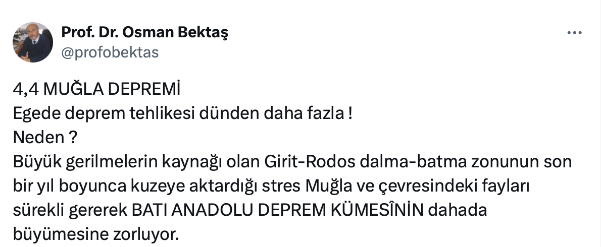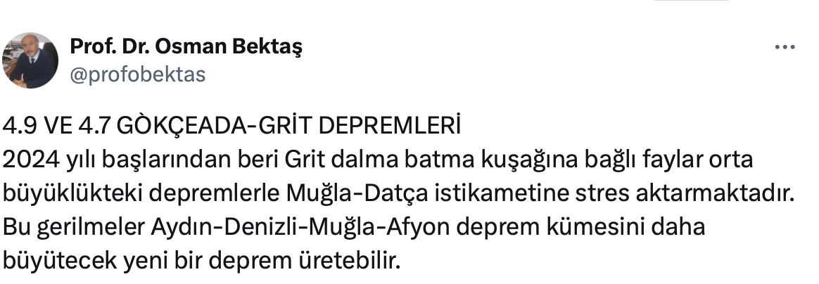 Yaptığı açıklamada 2024 yılı başlarından beri Grit dalma batma kuşağına bağlı fayların orta büyüklükteki depremlerle Muğla-Datça istikametine stres aktardığını belirten Osman Bektaş Bu gerilmeler Aydın-Denizli-Muğla-Afyon deprem kümesini daha büyütecek yeni bir deprem üretebileceğini kaydetti.