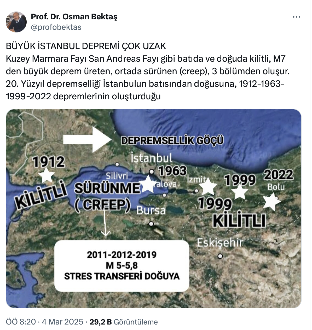 Prof. Dr. Osman Bektaş resmi sosyal medya hesabı https://x.com/profobektas üzerinden yaptığı paylaşımda büyük İstanbul depreminin çok uzak olduğunu söyledi.