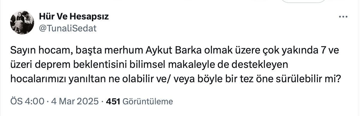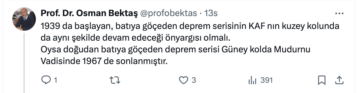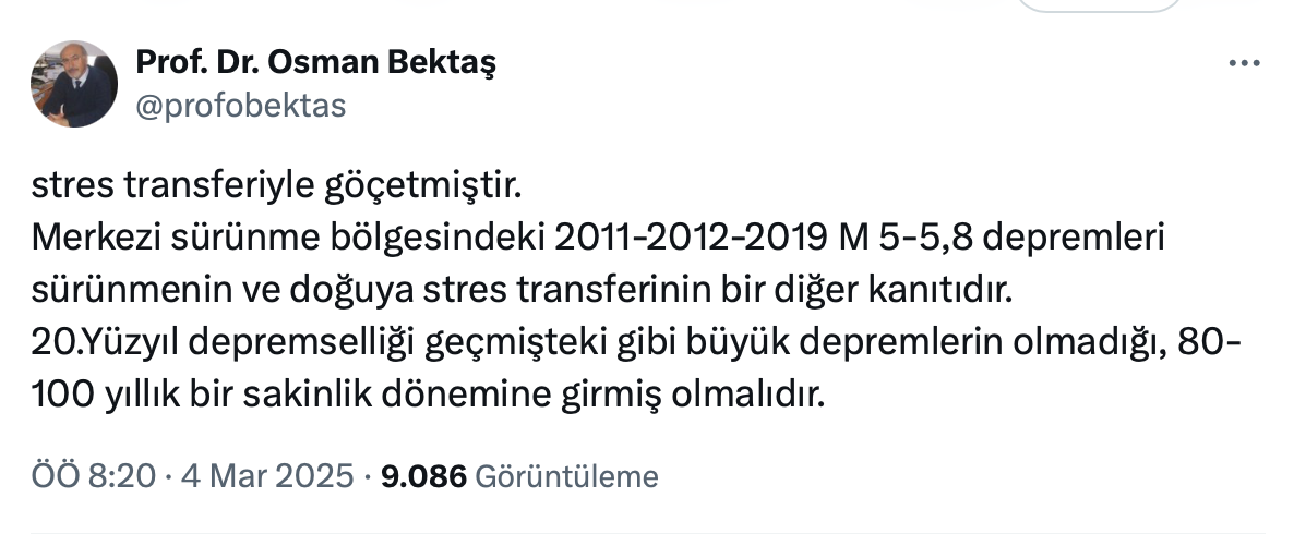 Deprem bilimci Prof. Dr. Osman Bektaş’ın paylaşımı şu şekilde:
