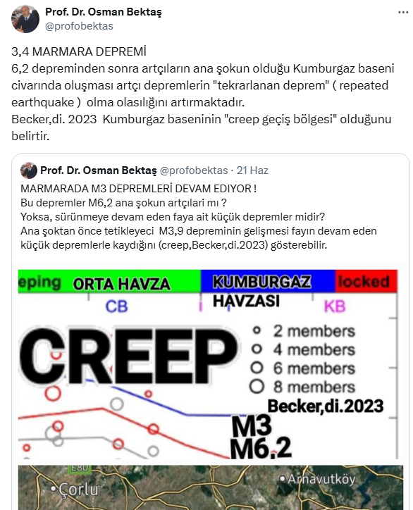 6,2 depreminden sonra artçıların ana şokun olduğu Kumburgaz baseni civarında oluşması artçı depremlerin "tekrarlanan deprem" ( repeated earthquake ) olma olasılığını artırdığını söyleyen deprem uzmanı Prof. Dr. Osman Bektaş, İstanbul için korktan açıklamada bulundu.